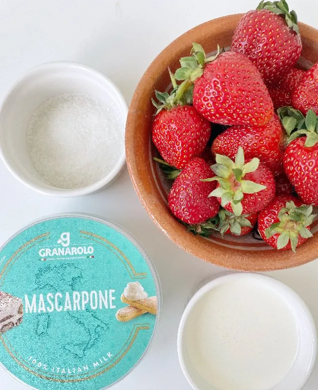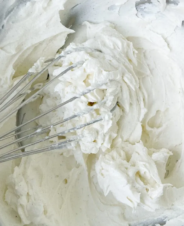Pendant ce temps, préparez la crème. Mélangez délicatement le mascarpone, la crème et le sucre glace avec un fouet ou un mixeur à la vitesse la plus basse. Faites attention à ne pas trop battre la crème, cela prend littéralement quelques minutes, juste pour obtenir un mélange homogène.
