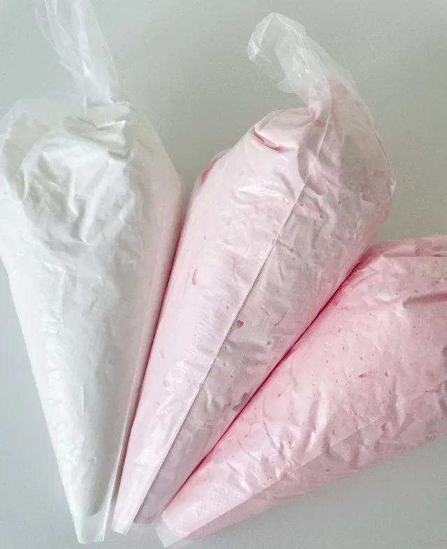 Divisez les blancs montés en trois parties. Laissez-en une blanche, colorez la deuxième en rose pâle et la troisième en une teinte plus sombre (vous pouvez aussi laisser les trois disques blancs, les couleurs ne feront que rendre le gâteau plus joli, sans influencer le goût). Pour pocher la meringue, utiliser des poches à douille jetables est pratique.