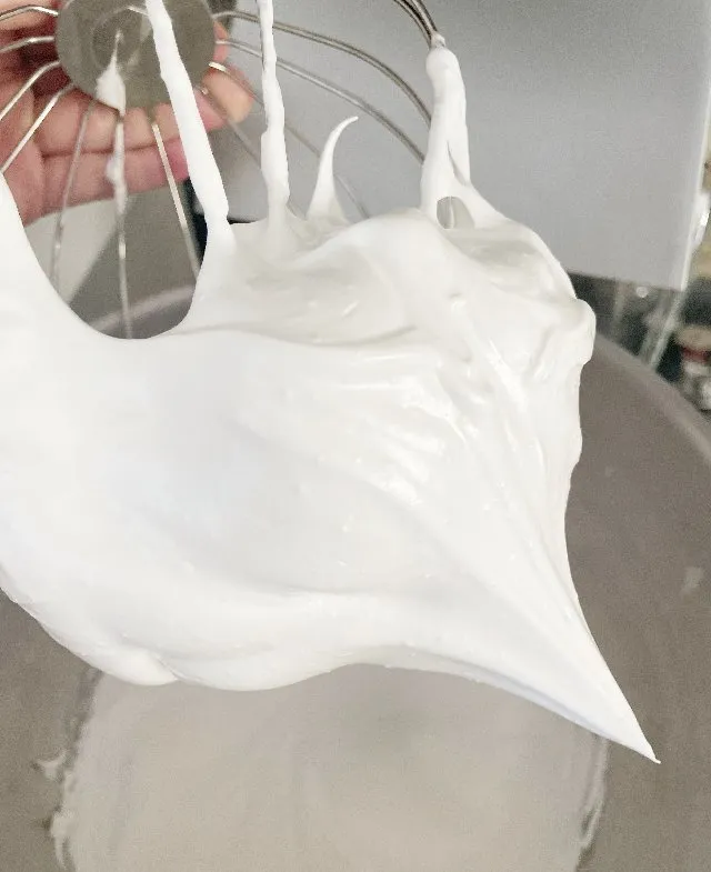 Continuez de battre, en ajoutant progressivement le sucre cuillère par cuillère. Poursuivez à vitesse moyenne jusqu'à ce que le sucre soit dissous. Enfin, ajoutez la fécule et mélangez délicatement. Voici la meringue dense et belle que nous avons obtenue.
